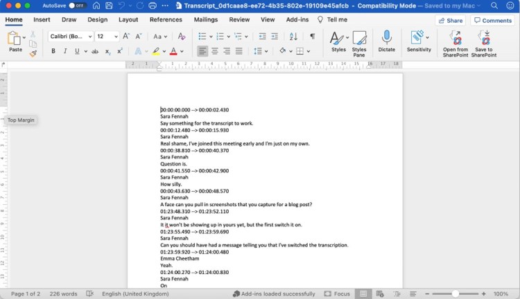 If you’ve used the transcript generated in classic Stream from meeting recordings, the actual transcript file will look very similar regardless of whether you download it in vtt or Word format.