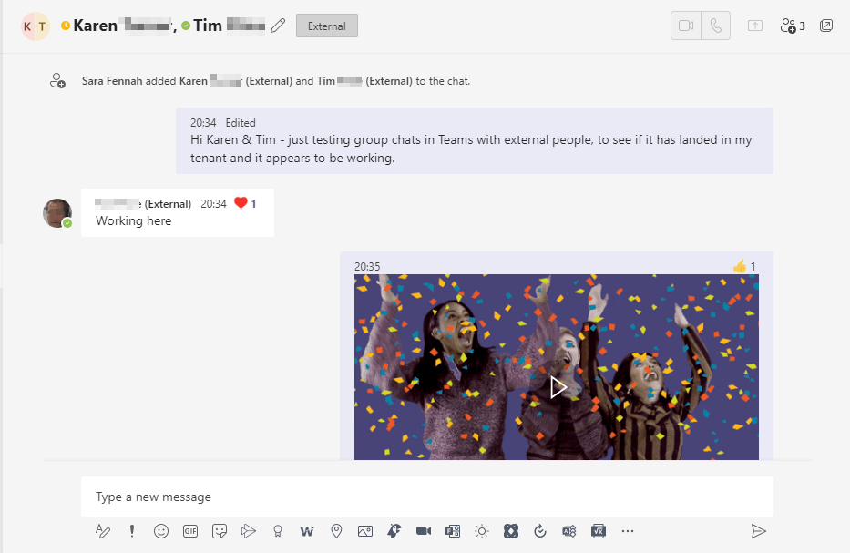 Group chats in Teams can now include external people. It’s as simple as creating any group chat in Teams. First, just make sure you can message the external people to be included in the group. In other words send them a Teams chat message. Then simply create a new group or add them to an existing group.