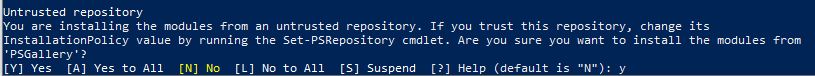 When you are installing PowerShell Modules, you will always be prompted to confirm download from the repository, as shown below. You should only confirm one repository at a time using Y response.