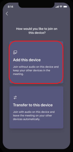 If you join from a meeting reminder, you will see the following screen, if the meeting is already in progress in the meeting room and should choose Add this device.