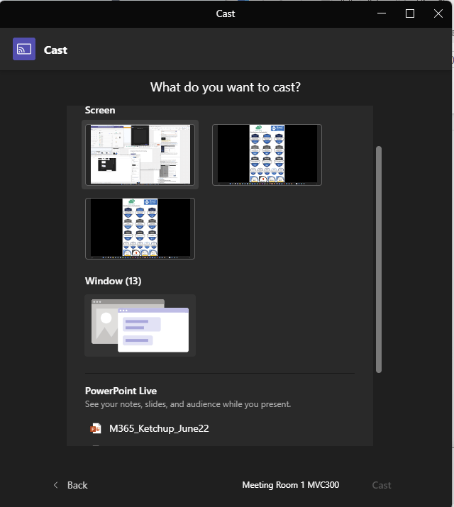 If you have you device with you and simply want to share something, there is no longer any need to connect your laptop to the meeting room system. The cast feature uses bluetooth to locate the meeting room, so both the companion device and meeting room need bluetooth enabled for this to work. First choose Cast from the … menu