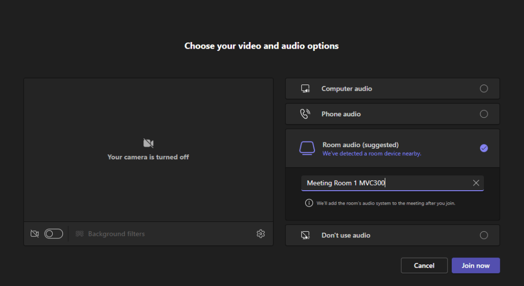 Companion mode (not its official name) is where you join a meeting but select the meeting room as the audio device. Note this is different to joining the meeting as yourself from a second device, here we are joining as ourselves but with audio disabled. For more information on joining as yourself from two or more devices see the guide for joining a Teams meeting on a second device from the Desktop or Mobile.