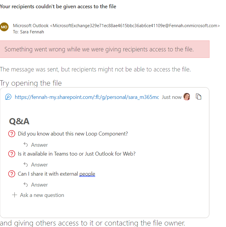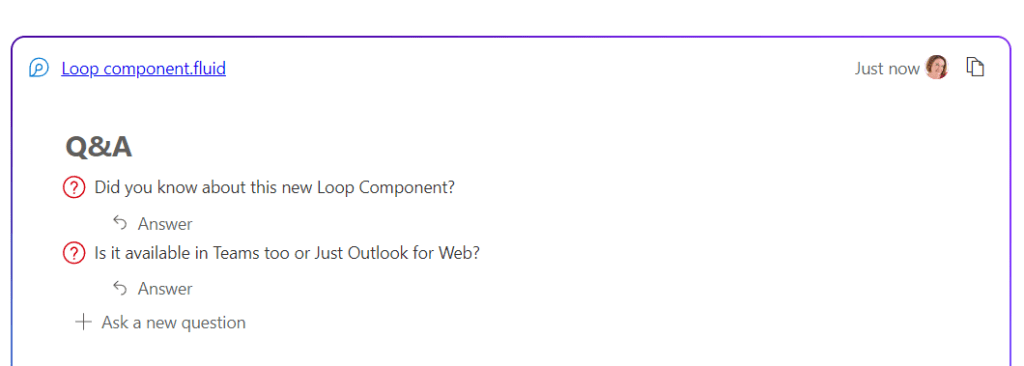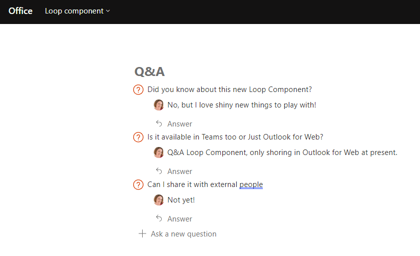 Which shall I try, oooh Q&A is new, I’ll try that one. A quick click adds the Loop component to my message. As it’s a first time use, up pops a little reminder about what a Loop component is.