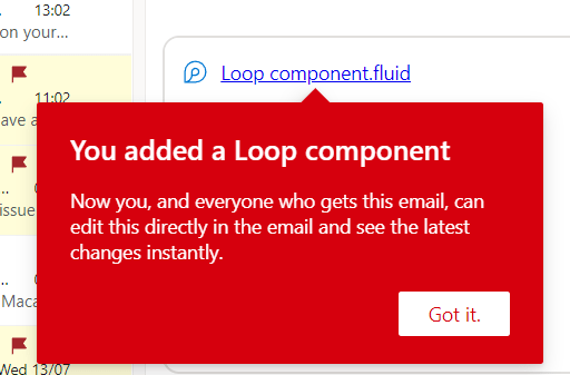 I was very excited to note that Loop had appeared in my Outlook for web mail compose window, so had a quick “play”.