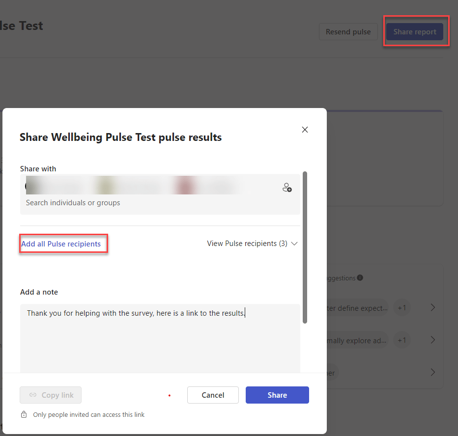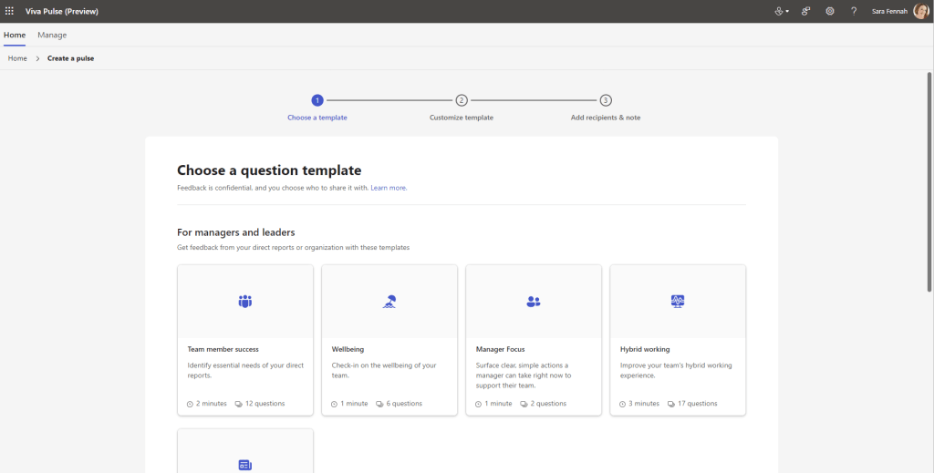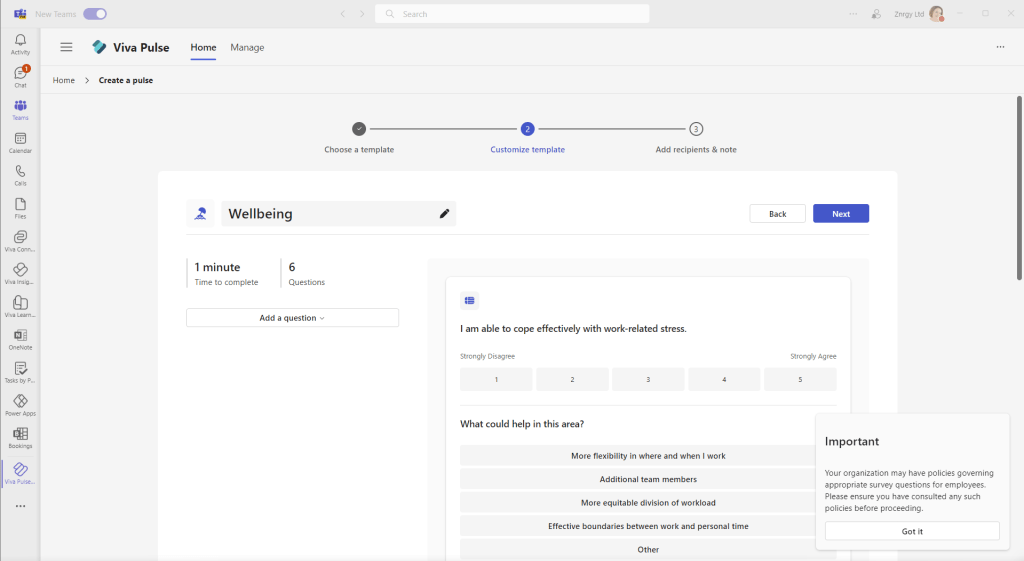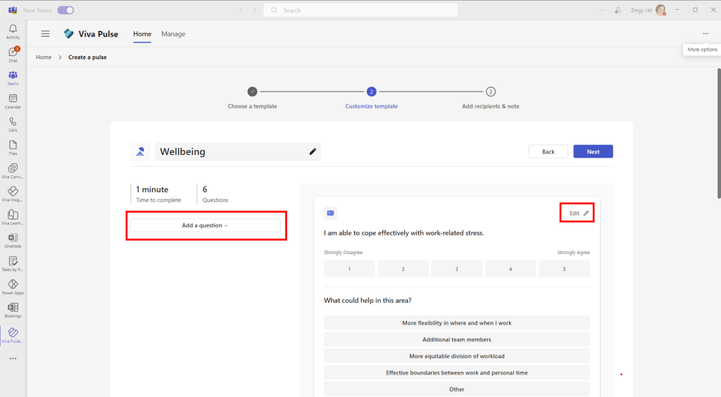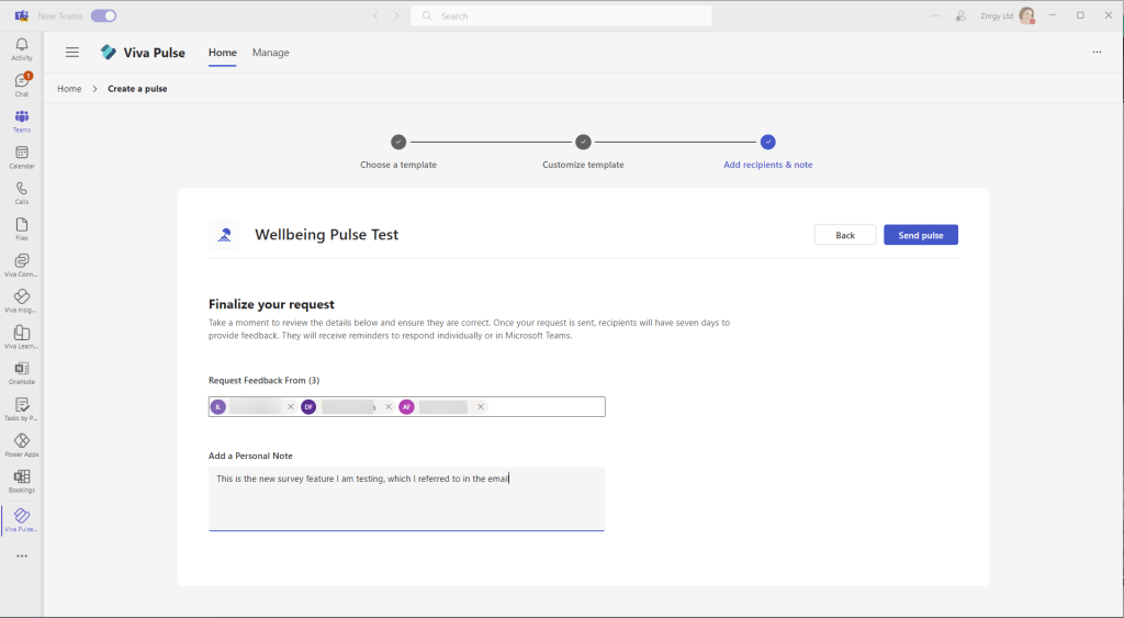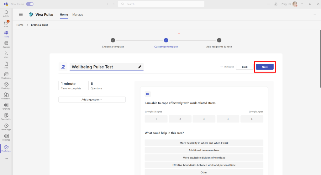 In this first walk through, I left the survey with the default questions, but edited the survey title to Wellbeing Pulse Test and clicked Next to choose recipients