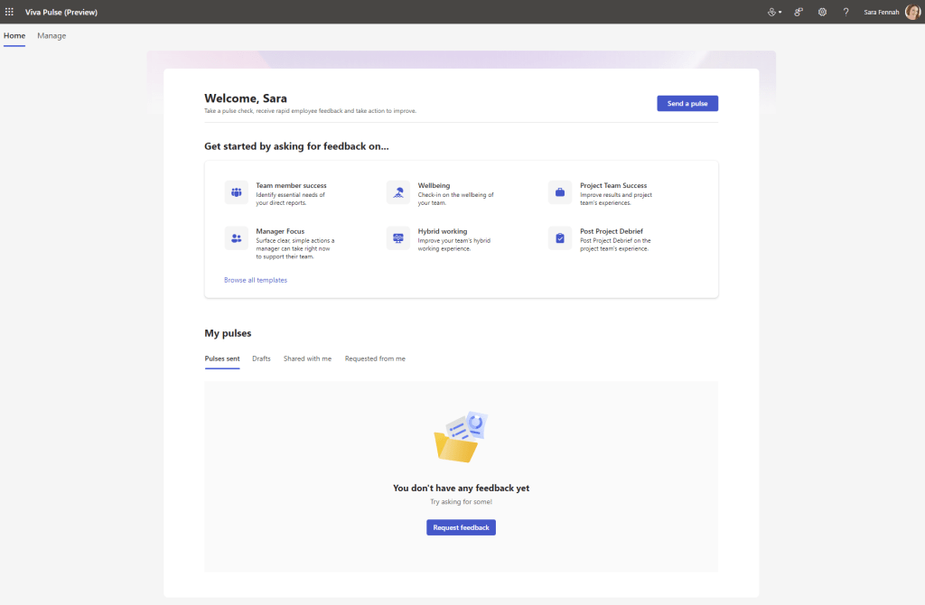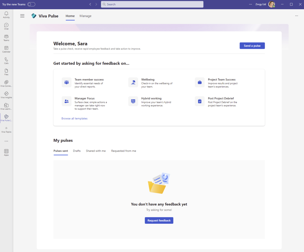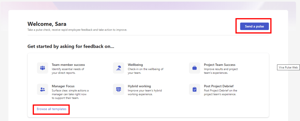 To send your first pulse, you can click Send a pulse or Browse all templates